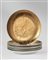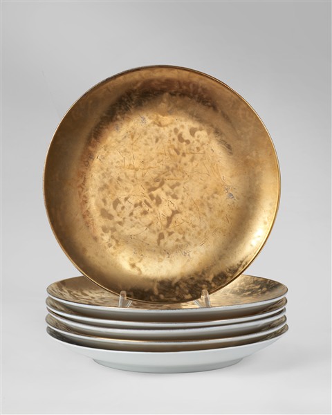 Sei piatti con decoro "Grande antico". Milano, inizi anni '60. Porcellana decorata in oro maculato. (d cm 21) (lievi difetti)