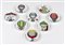Otto piattini della serie "Palloni". Milano, anni '60. Porcellana serigrafata in nero e policromia. Marcati e titolati sotto la base. In scatola originale. (d cm 10)