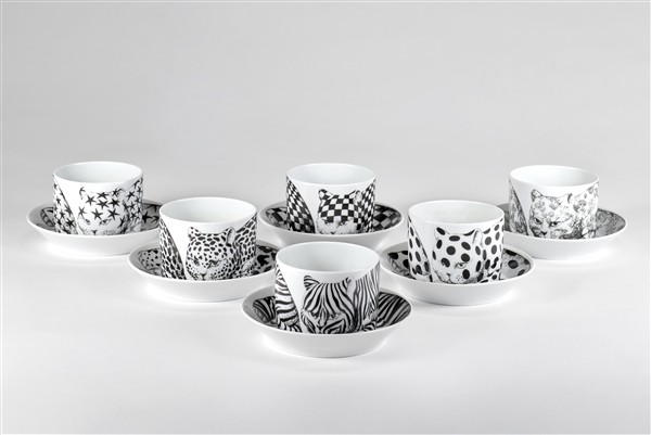Fornasetti Sei tazze con piattino della serie "High fidelity". Milano, anni '80.