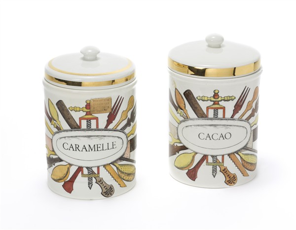 Due contenitori con coperchio in porcellana decorata in serigrafia e iscritta "CARAMELLE" e "CACAO". Milano, anni '60/'70. (h cm 22) (difetti)