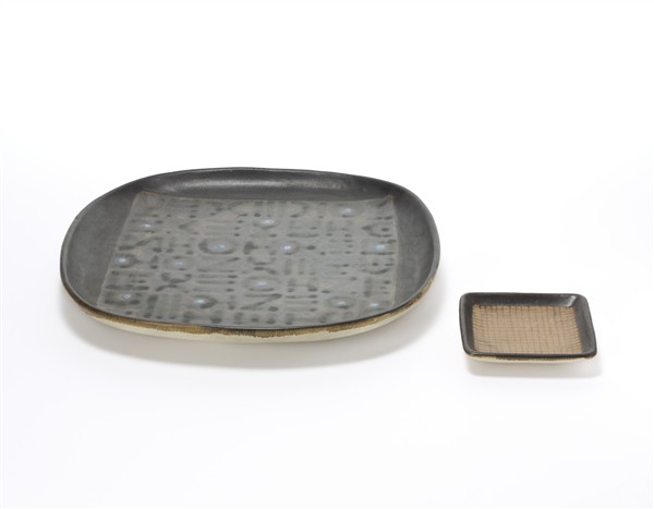 Lotto composto da un piatto decorativo in terracotta smaltata nei toni del bruno, beige e celeste con decoro a soggetto geometrico. Firmato in bruno al verso "BRUNO GAMBONE" (cm 38,5x38,5). E uno svuotatasche in terracotta smaltata nei toni del bruno e beige con decoro a griglia quadrata. Firmato in bruno al verso "GAMBONE ITALY" (cm 13x13). Italia, anni '70/'80.