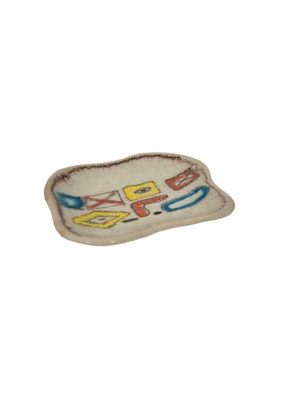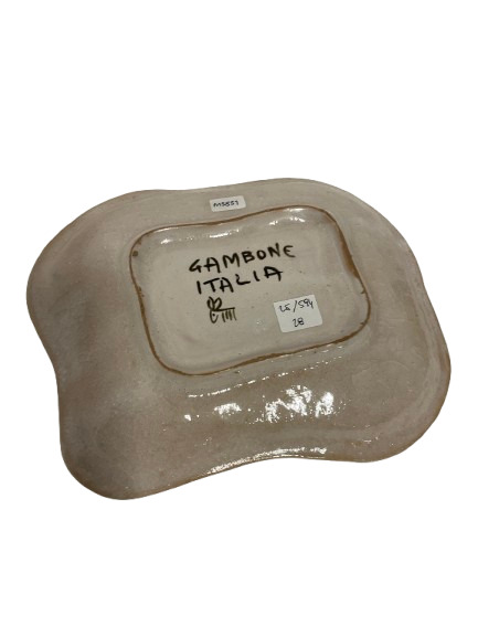 Posacenere in ceramica smaltata in policromia con soggetti geometrici e invetriata. Vietri sul Mare, anni '50. Fimato sotto la base in nero "GAMBONE ITALIA" e con il simbolo grafico dell'asinello. (cm 18x15)