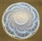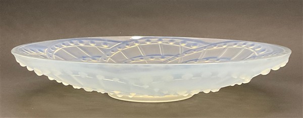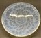 Centrotavola in vetro opalescente pressato in forma con decori a rilievo a motivi geometrici. Francia, seconda metà secolo XX. Firmato a rilievo "J Landier France". (d cm 34) (lievi difetti)