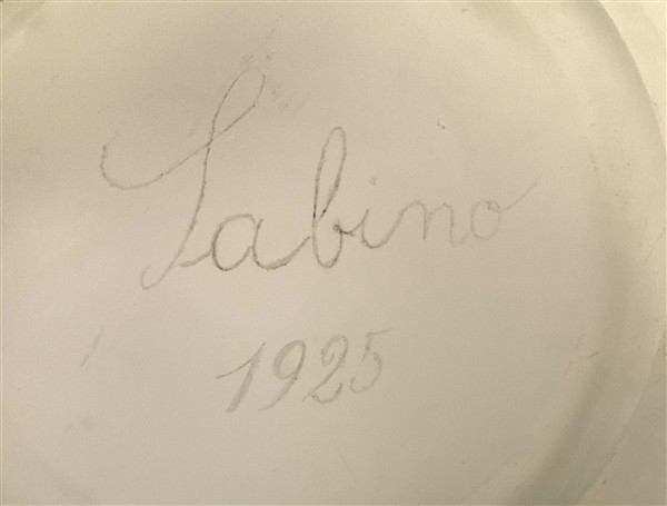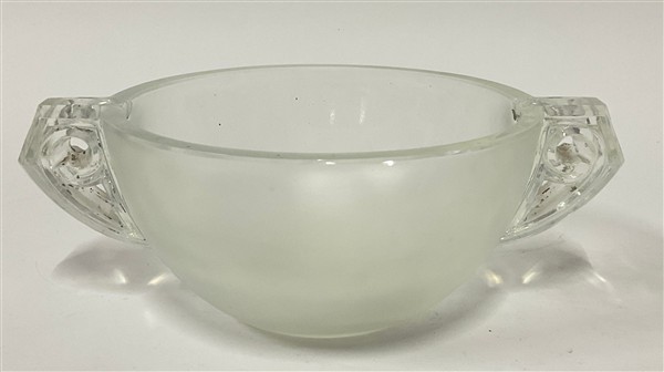 Coppa biansata in vetro opalescente pressato in forma con anse geometriche. Firma "Sabino France" a rilievo nel cavetto e "Sabino 1925" incisa sotto la base. Francia, anni '20. (cm 26x9x18,5)