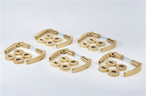 Gruppo di cinque maniglie modello "Tesi lucido". Produzione Olivari, Novara, anni '90. Ottone lucidato. In scatola originale.
