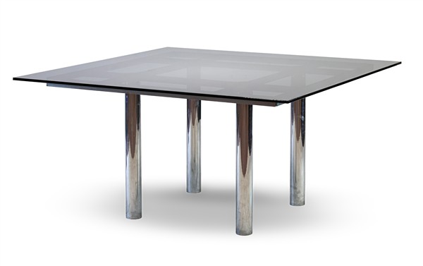 Tavolo basso in metallo cromato con piano quadrato in cristallo fumé modello "Quadrato Andrè". Produzione Gavina, San Lazzaro di Savena, anni '70. Struttura in acciaio cromato e piano in vetro fumé. Etichetta adesiva del produttore. (cm 136x68x136) (lievi difetti)