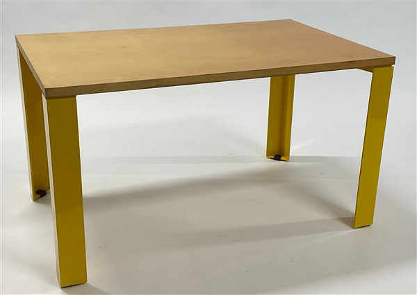 Tavolo modello "Eretteo 72". Produzione Artemide, Milano, 1976ca. Gambe in materiale plastico giallo e piano impiallacciato in betulla. (cm 129x72x80)