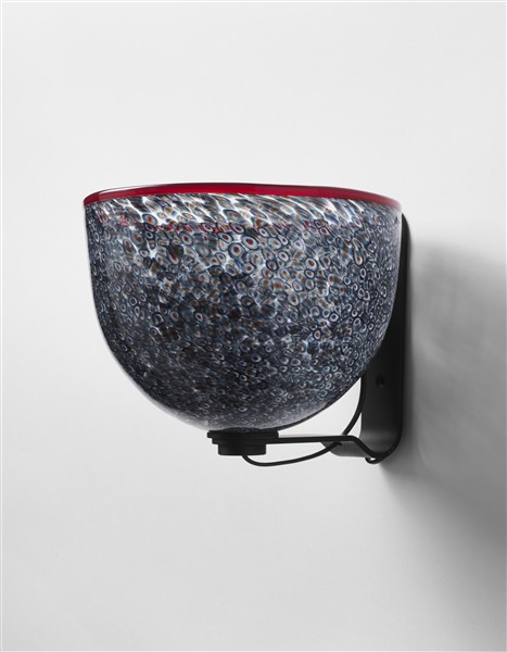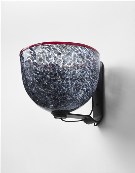 Lampada da parete della serie "Neverrino". Produzione Vistosi, Murano, anni '70. Vetro soffiato a murrine grigio e lattimo incolore con orlo applicato a caldo in vetro trasparente rosso. (h cm 22; d cm 26)