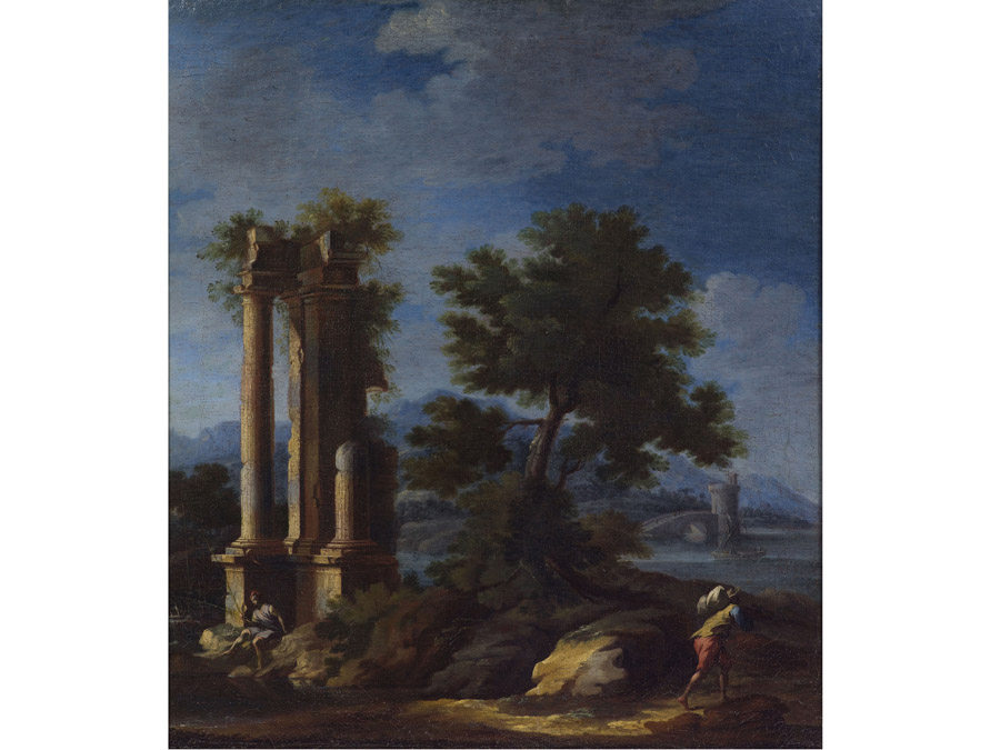 Gennaro Greco (Napoli 1665-1714) Paesaggio con rovine Olio su tela 55x47.7 cm