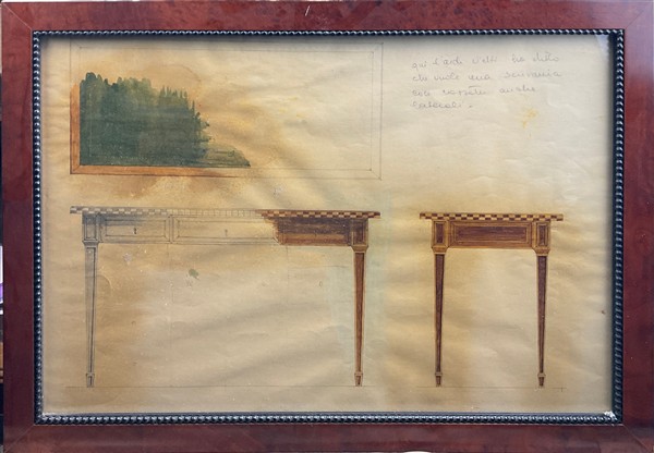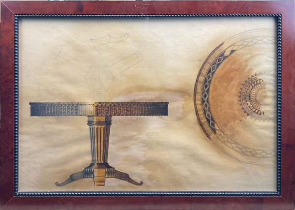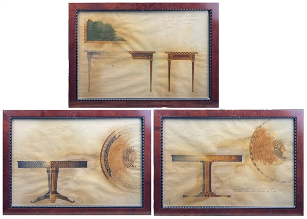 Gruppo di tre studi per arredamento. Tecnica mista su carta (cm 33x48) in cornice. Secolo XX. (difetti)