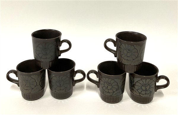 Lotto di sei tazze in ceramica smaltata marrone con decori floreali di gusto Arts and Crafts. Inghilterra, anni '70.