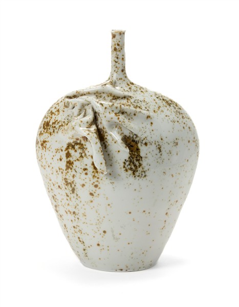 Vaso a collo stretto in ceramica a pasta grigia smaltata a macchie color ruggine sotto vetrina e decorato a rilievo con un drappo accartocciato. Italia, seconda metà secolo XX. Firmato sotto la base. (h cm 19)