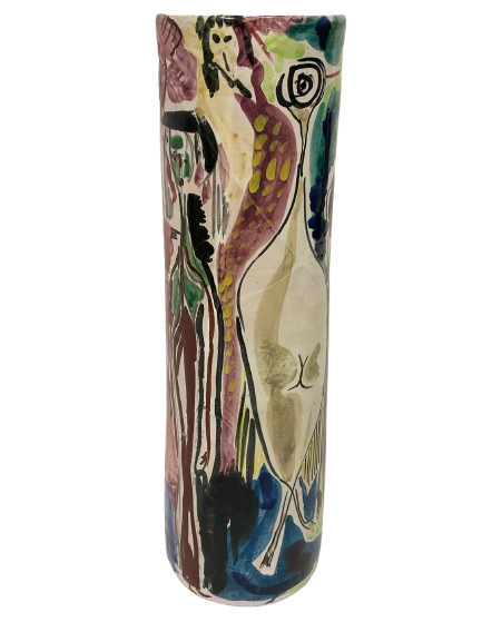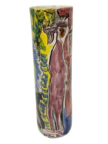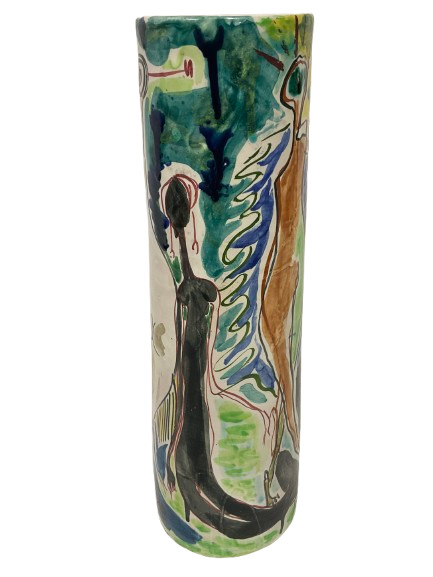 Grande vaso troncoconico in ceramica smaltata in policromia sotto vetrina. Albisola, 1952. (h cm 46,5)