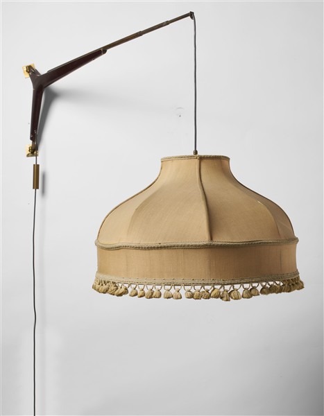 Lampada da parete estensibile a saliscendi in ottone e legno massello verniciato marrone, paralume in stoffa. Italia, anni '40. (l max cm 176) (difetti)