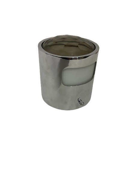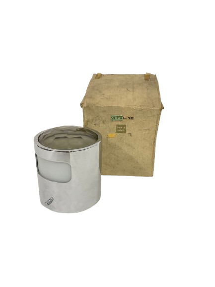 Faretto in metallo cromato, vetro fumé e bianco satinato. Italia, anni '70. Recante etichetta del produttore. In scatola originale. (h cm 15,5; d cm 14)