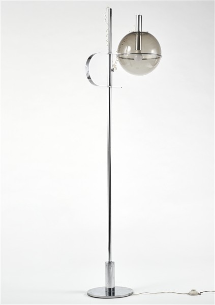 * Lampada da terra. Italia, anni '70. Struttura in metallo cromato e diffusore sferico orientabile in vetro fumé. (lievi difetti)