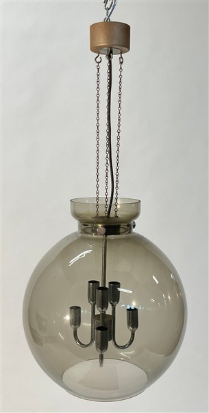 Lampada a sospensione con diffusore sferico in vetro soffiato fumé e struttura in metallo cromato. Germania, anni '70. (h cm 80; d cm 40) (lievi difetti)