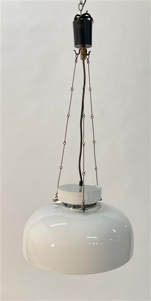 Lampada a sospensione con diffusore in vetro incamiciato lattimo e struttura in metallo cromato e plastica nera. Italia, anni '70. (d cm 40) (lievi difetti)