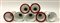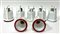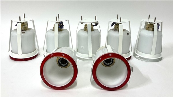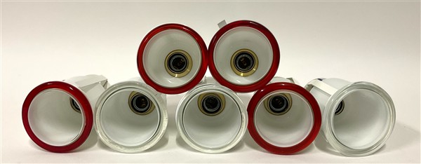 Lotto di sette faretti a incastro modello "Bossa-nova". Murano, anni '70. Quattro rifiniti in vetro rosso, tre in vetro lattimo. In scatola originale. (h cm 17; d cm 12)