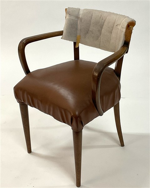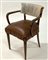 Sedia a braccioli in mogano, gambe anteriori troncocniche. Seduta rivestita in similpelle marrone. Italia, anni '40. (difetti e mancanze)
