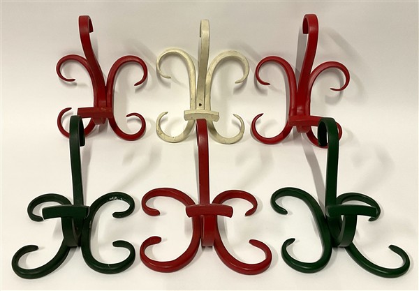 Lotto di sei appendiabiti in legno curvato: due verdi, tre rossi e uno bianco.