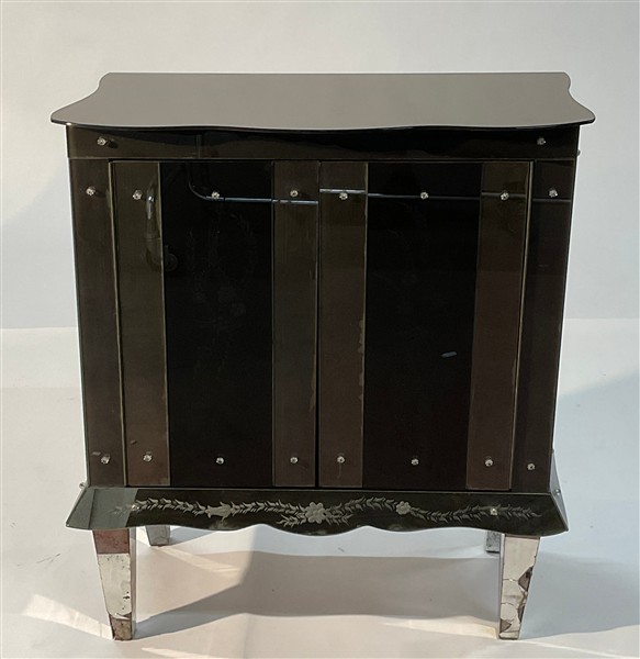 Mobiletto a due ante rivestito in lastre di vetro specchiato e decorato a getto di sabbia con motivi floreali, interno specchiato con un ripiano in cristallo. Italia, anni '50. (cm 75x89x33) (difetti e mancanze)