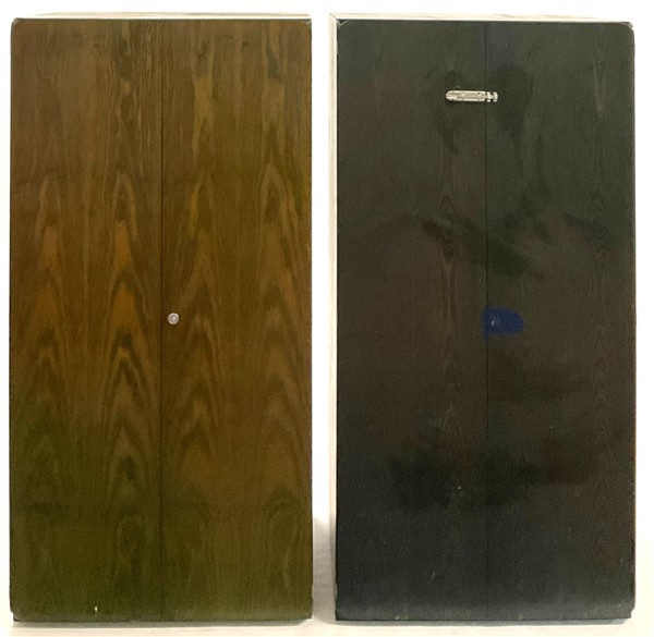 Coppia di armadi a due ante della serie "Samara". Produzione Maisa, Belgio, anni '70/'80. Legno tinto verde e verde smeraldo. (cm 76x154x57) (lievi difetti e modifiche)