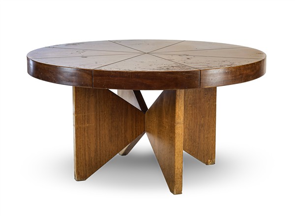 Ferdinando Maccani Tavolo con piano circolare e sostegno geometrico in legno impiallacciato