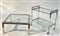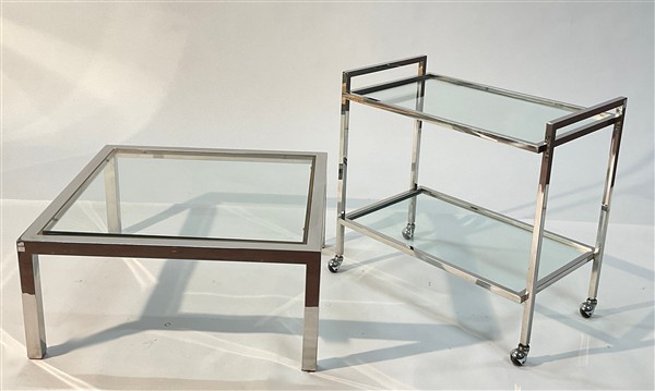 Lotto composto da due tavoli da caffè in metallo cromato e ottone con piano in cristallo molato (cm max 110x36,5x110) e un carrellino in metallo cromato con due ripiani in vetro (cm 74x71x45). Italia, anni '70. (lievi difetti)