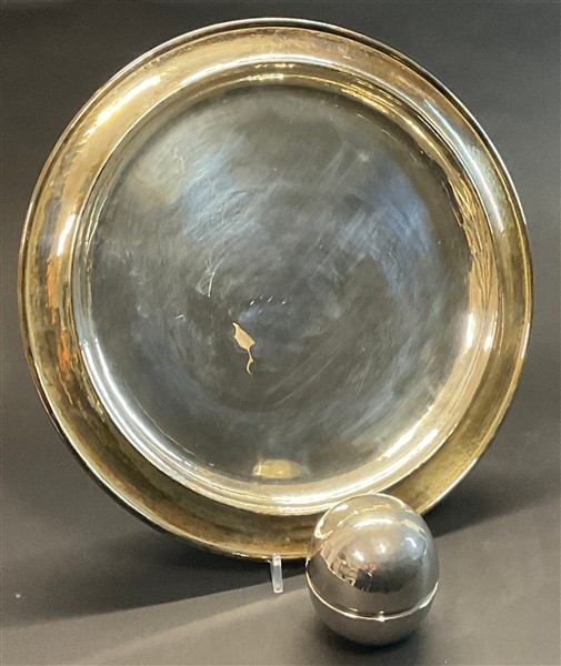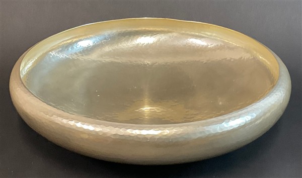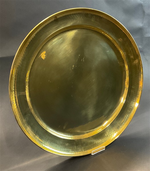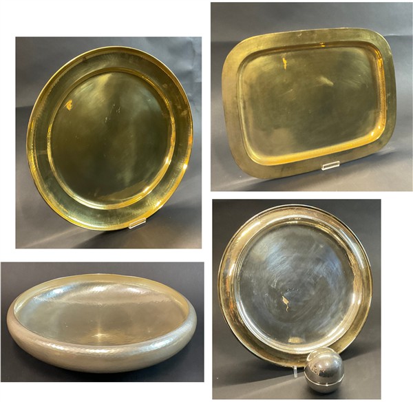 Lotto di tre diversi vassoi in ottone lucidato e in metallo argentato, un centrotavola e una scatolina in metallo martellato. Firmati a incussione sotto la base. (l max cm 50) (lievi difetti)