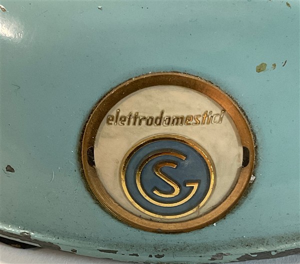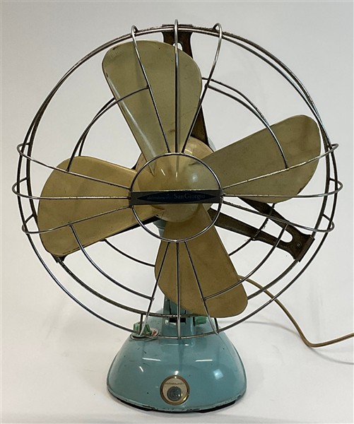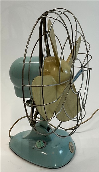 Ventilatore da tavolo con struttura in metallo verniciato celeste e braccio regolabile. Produzione Elettrodomestici San Giorgio, Italia, anni '50. (h cm 41) (difetti)