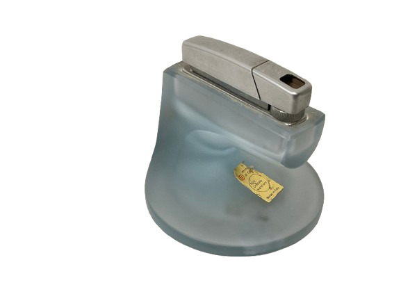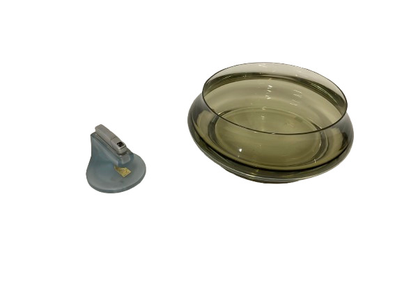 Centrotavola in vetro sommerso ambrato e cristallo. Murano, anni '50/'60. Recante etichetta cartacea del produttore. Unito a un accendino da tavolo in vetro acidato celeste, anni '70. (d cm 25)