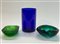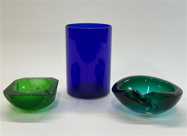 Lotto composto da un vaso in vetro blu di Simone Cenedese, e due posacenere in vetro verde e blu. Seconda metà secolo XX. (cm max 13x20) (difetti)
