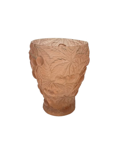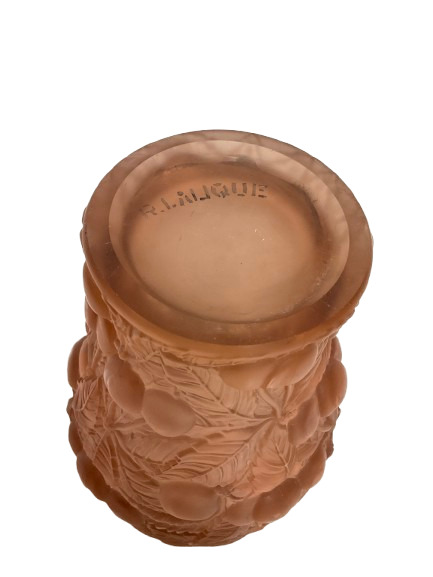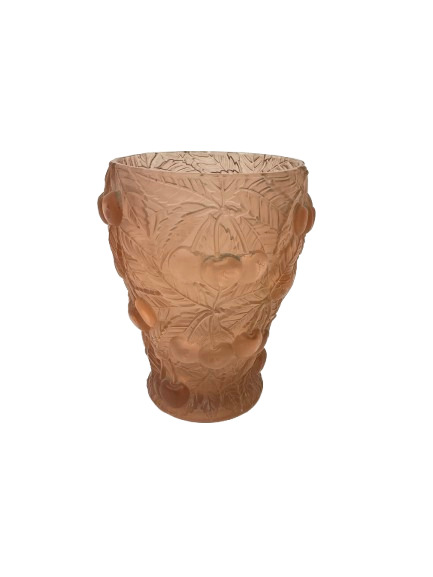 Vaso in vetro rosino trasparente soffiato in stampo, molato e acidato con decoro a rilievo raffigurante ciliegie. Secolo XX. Iscritto a punta "R. LALIQUE" sotto la base. (h cm 18) (lievi difetti)