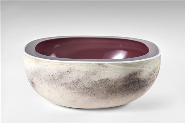 Centrotavola in vetro incamiciato di forte spessore lattimo e ametista trasparente, lavorato a scavo sulla superficie esterna. Anni '70. Firmato a punta e recante etichetta. (d cm 25)