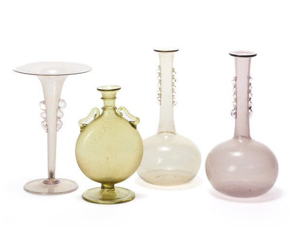 Lotto composto da quattro vasi in vetro soffiato trasparente, due color glicine, di cui uno iridato sulla superficie esterna, e due color pagliesco, di cui uno con inclusione di foglia d'oro, anse applicate a caldo. Anni '30. (h max cm 18)