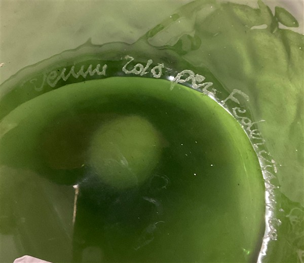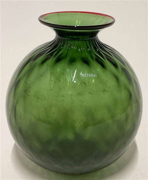 Vaso globulare della serie "Balloton". Murano, 2010. Vetro soffiato trasparente verde con orlo pasta vitrea rossa. Firmato a punta sotto la base. (h cm 16)