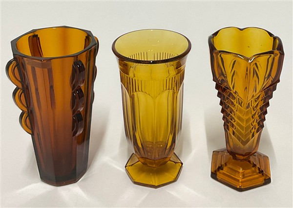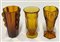 Lotto di tre vasi diversi in vetro stampato color ambra. Seconda metà secolo XX. (h cm 20,5)