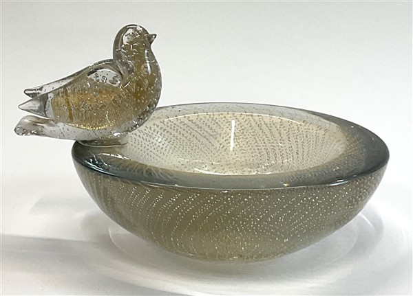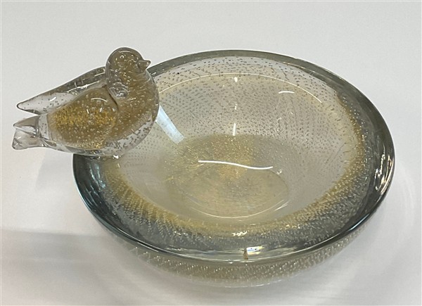 Ciotola svuotatasche decorata da colomba applicata a caldo in vetro soffiato cristallo di forte spessore con inclusione di foglia d'oro e bollicine regolarmente disposte. Secolo XX. (l cm 21,5) (difetti)