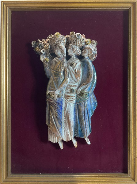 Gruppo scultoreo in terracotta smaltata in policromia sotto vetrina. Montato su pannello con fondo in velluto rosso e cornice in legno dorato. (scultura cm 38,5x22,5; cornice cm 61,5x46,5) (difetti)