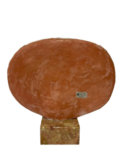Tondo in ceramica decorato con due volti femminili in policromia a graffito sotto vetrina. Montato su base in marmo. Manifattura Rossicone, Milano, anni '50/'60. Firmato in basso a sinistra. (cm 29x27)
