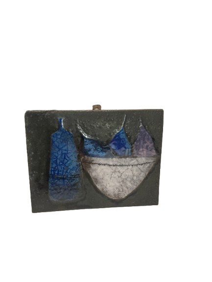 Romano Rui "Natura morta con pere" Formella in ceramica smaltata in verde, blu,