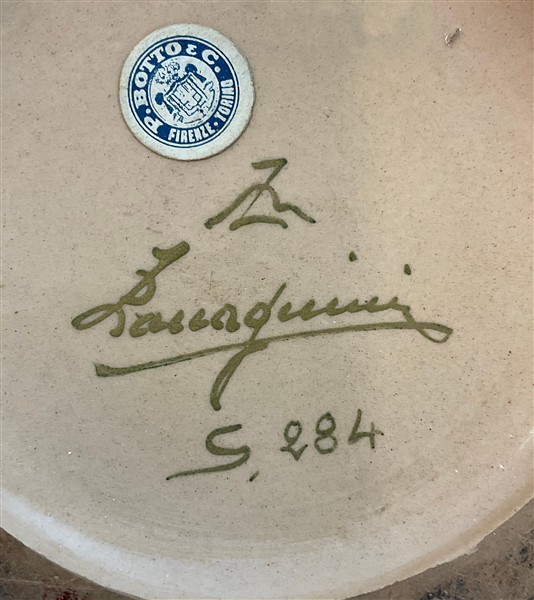 Contenitore con coperchio in ceramica con decorazione a corda e doratura. Manifattura Zaccagnini, Firenze, 1930ca. Firma e numerali in oro sotto la base. (h cm 15; d cm 16) (difetti)