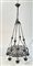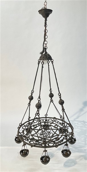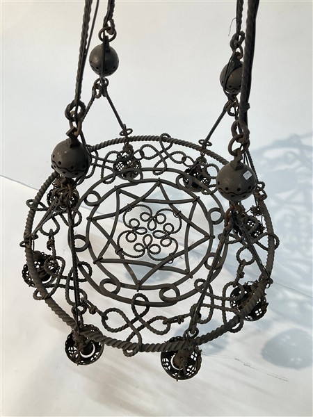Lampadario a cesendello in ferro battuto e brunito a otto luci con elementi a corde intrecciate e attorcigliate, sfere di collegamento fra i tiranti. Milano, 1900ca. (h tot cm 167) (difetti e modifiche)