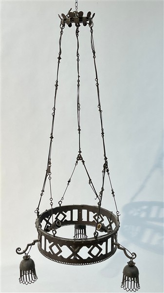Lampadario a cesendello in ferro battuto e traforato a sei luci. Italia, 1910ca. (h cm 140) (lievi difetti)