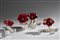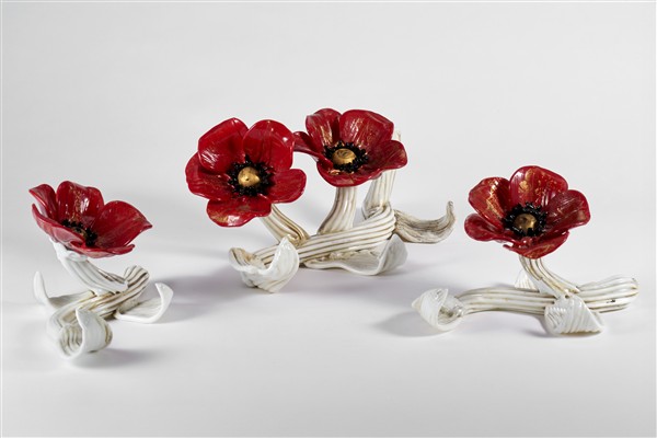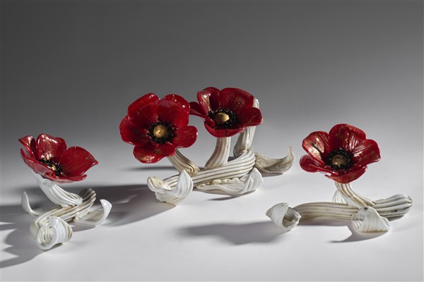 Lotto composto da tre papaveri. Murano, 1935ca. Vetro cristallo e lattimo, pasta vitrea rossa e nera con applicazione di foglia d'oro. Recante etichetta cartacea "murano ars - FTB". (l cm 40) (gravi difetti)