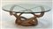 * Tavolo basso con struttura in ferro forgiato e tinto ocra e piano in cristallo. Francia, produzione recente. (h cm 40; d cm 106,5) (difetti e mancanze)