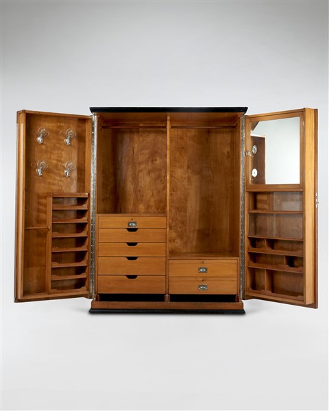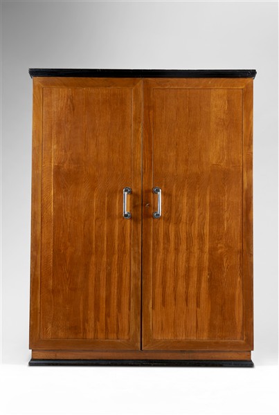 Armadio a due ante in legno massello impiallacciato. Italia, anni '40/'50. Base e coronamento a modanature in legno ebanizzato, maniglie in ottone e metallo nichelato, interno impiallacciato in legno chiaro e bipartito con sette cassetti e ante attrezzate rispettivamente con quattro appendini in cristallo sabbiato e decorato con antilopi, sette ripiani e una barra appendi bastoni, l'altra anta ha uno stipo a specchio, due stipi ad ante scorrevoli in vetro cristallo e tre ripiani attrezzati. (cm 149x198x73) (lievi difetti)