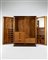 Armadio a due ante in legno massello impiallacciato. Italia, anni '40/'50. Base e coronamento a modanature in legno ebanizzato, maniglie in ottone e metallo nichelato, interno impiallacciato in legno chiaro e bipartito con sette cassetti e ante attrezzate rispettivamente con quattro appendini in cristallo sabbiato e decorato con antilopi, sette ripiani e una barra appendi bastoni, l'altra anta ha uno stipo a specchio, due stipi ad ante scorrevoli in vetro cristallo e tre ripiani attrezzati. (cm 149x198x73) (lievi difetti)