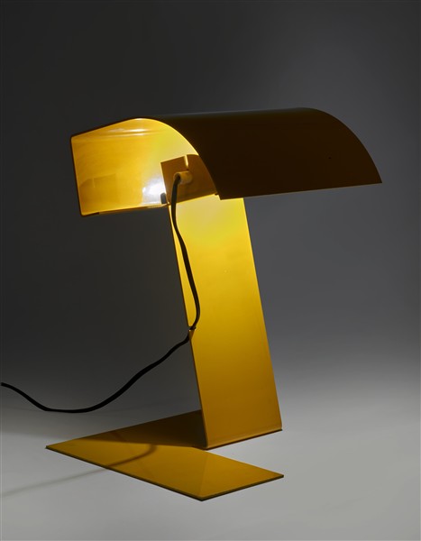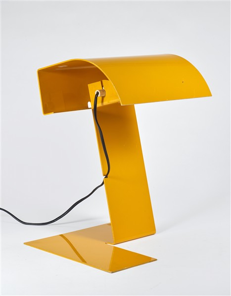Lampada da tavolo modello "Blitz". Produzione Stilnovo, Milano, 1969. Foglio di alluminio piegato e laccato giallo. Recante etichetta del produttore. (h cm 37,5) (lievi difetti)